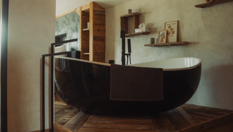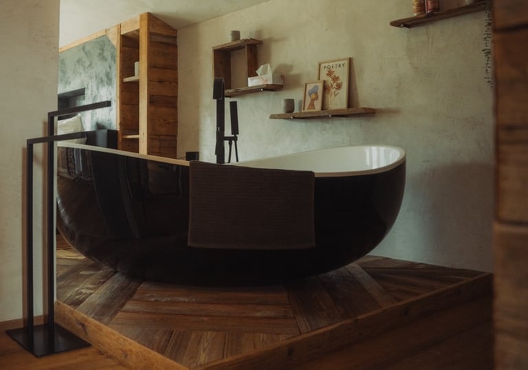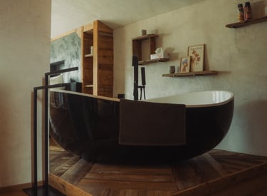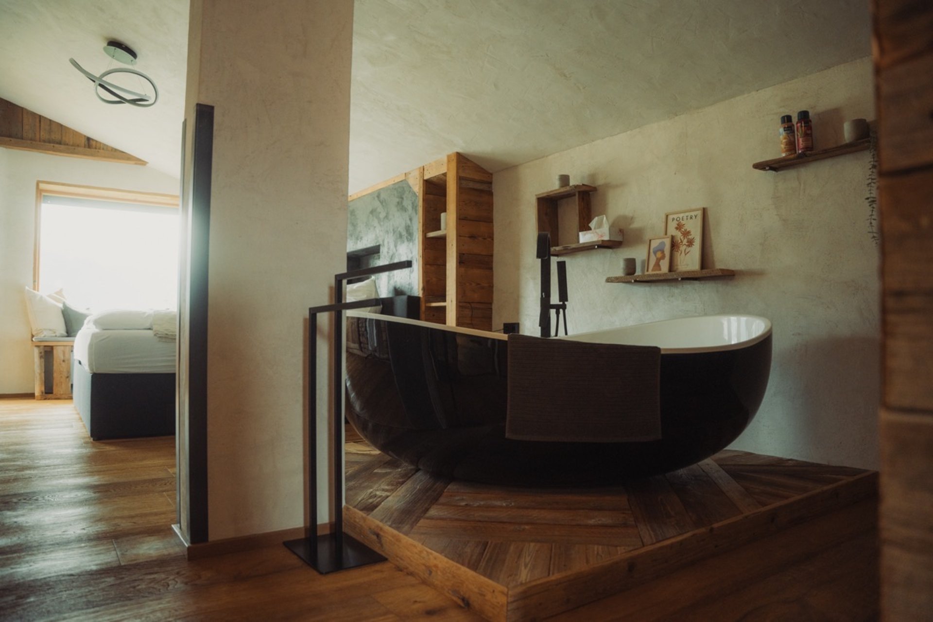 Gönn dir ein Bad in der freistehenden Wanne und lasse den Tag bei einem Glas Wein ausklingen.