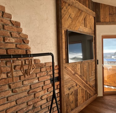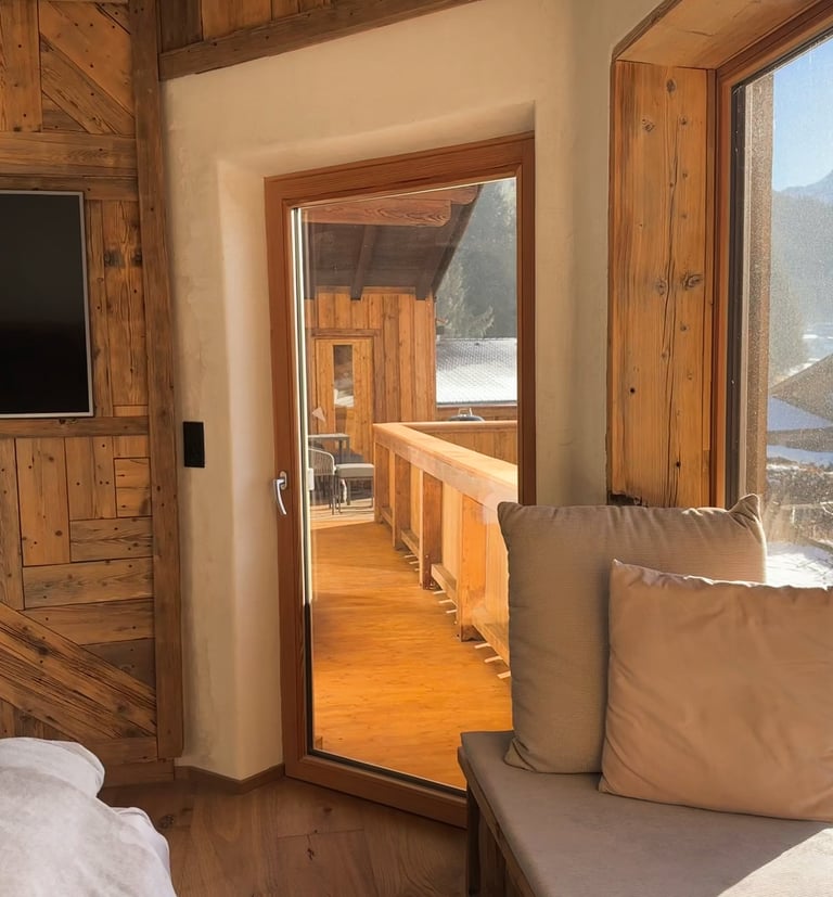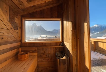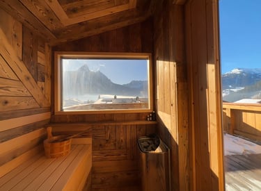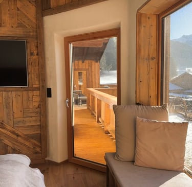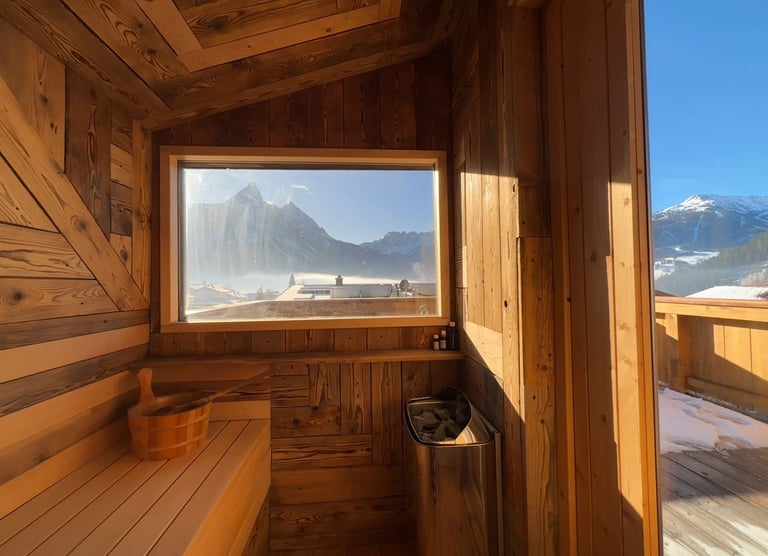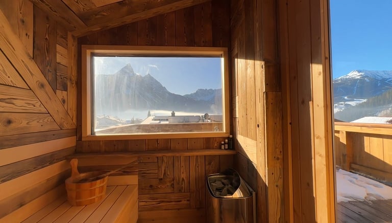 Entspanne auf dem Panoramabalkon und genieße dabei deine ganz private Sauna mit Bergblick.